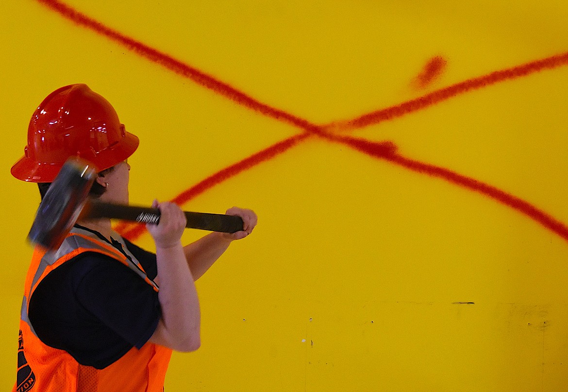 The bright yellow walls of the North Lake County Library building in Polson had big red x’s on them indicating which walls were to be demolished as construction began on the building May 3.