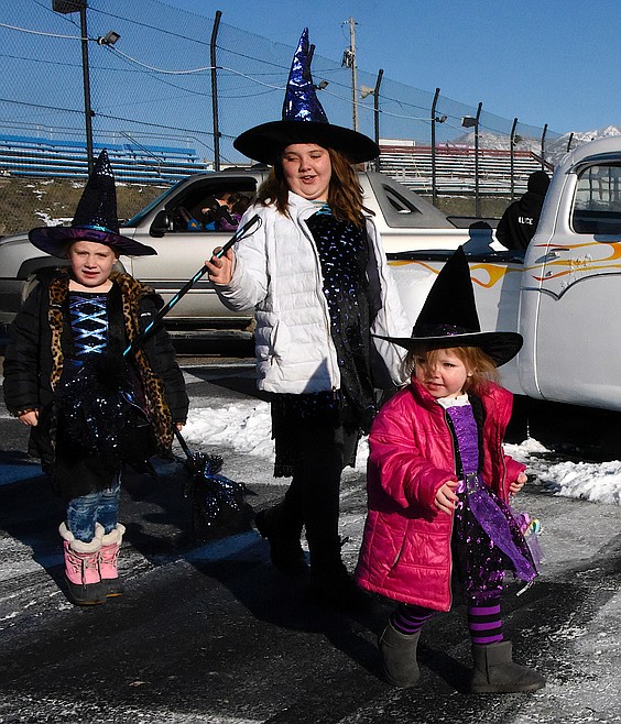 Cars and pickups, regular, vintage, and race, pulled onto the track in front of the bleachers, added lights, spiderwebs and fangs to their trunks, and then set up the candy. Shawn and Ange Parker decorated their car last year but ran out of candy so they stocked up this year.