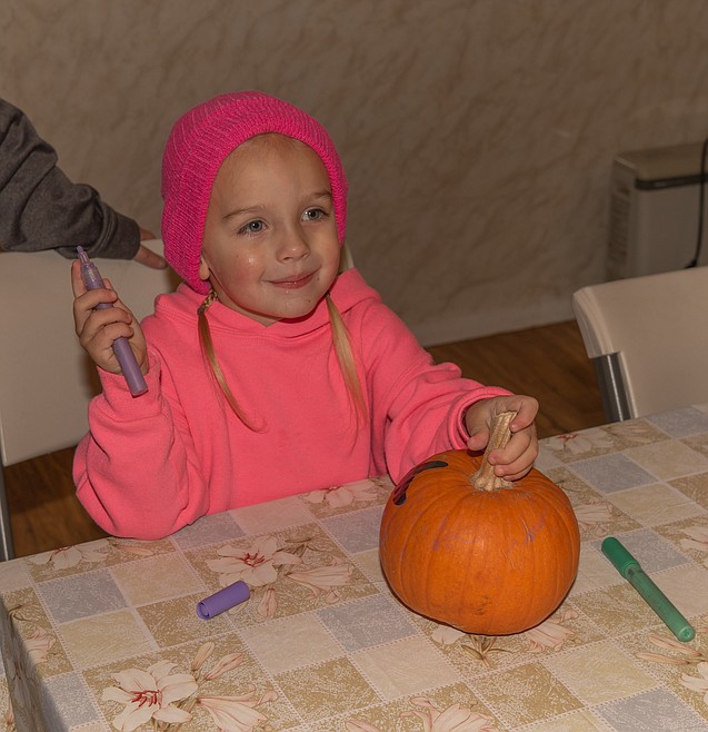 As the day slowly descended into darkness, the streets filled with children of all ages, dressed in the latest and scariest costumes. The first event of the evening was a pumpkin decorating activity, sponsored by the United Methodist Church and the Plains Women’s Club. This was their sixth year organizing the event. Pumpkins lined the tables, waiting for kids to personalize them with stickers and magic markers.