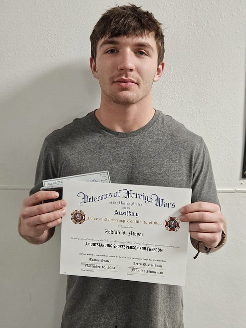 Troy student Zekiah Meyer displays the Voice of Democracy Certificate of Merit and check he received from Troy VFW Post 5514 and its auxiliary. (Photo courtesy Troy Junior Senior High School)