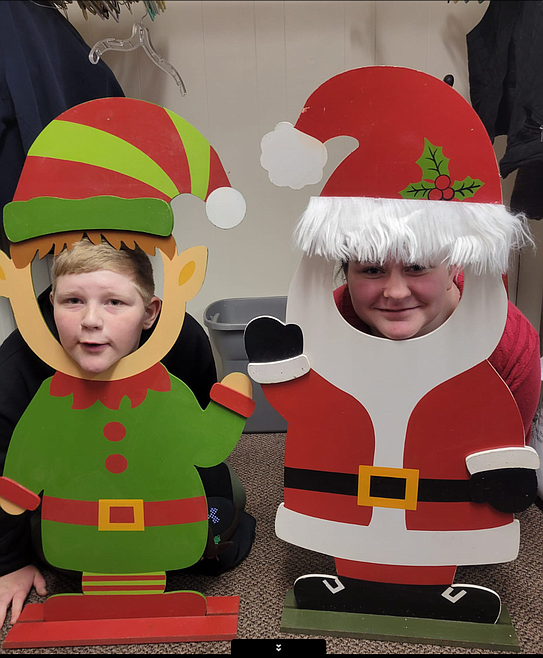 Kids pose in Santa and elf cutouts at the 2022 Pinehurst Christmas Festival.