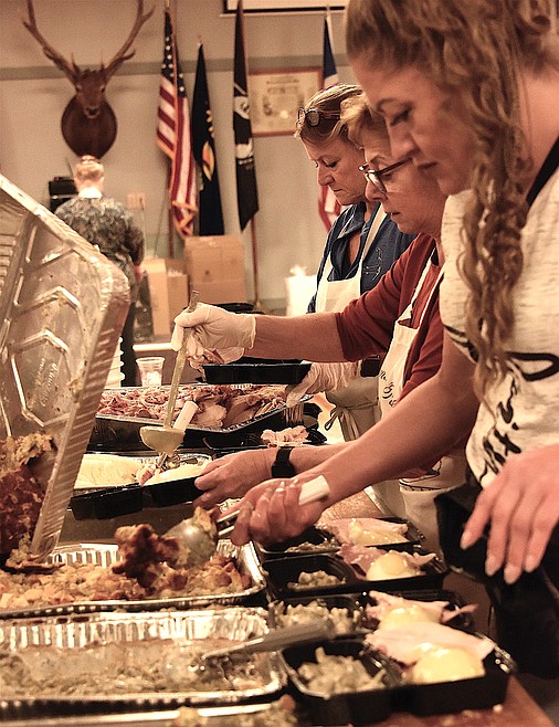 Turkey, mashed potatoes and gravy, cranberry sauce, and salads were at the Elks Club, and the Thanksgiving volunteers had worked all day Wednesday and Thursday morning to make sure everything was prepared.
