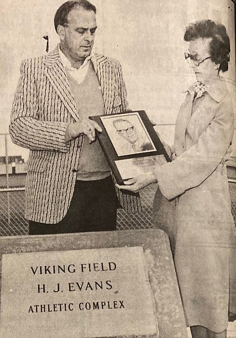In a recent column, Huckleberries told you about the opening of Harold Evans sports complex at Coeur d’Alene High (Sept. 15, 1978). But it didn’t tell you much about Principal Evans, the man behind the name who guided CHS from 1945 to 1966 (not 1954-66 as previously reported). A follow-up Press story provided more information about him: “He was remembered for taking in stray puppies and temporarily housing them in his file cabinet until they were claimed by the students they had disobediently followed to school.” And “He spent more time in the classroom, hallways and gymnasium than in his office, hungering to be in direct contact with the students he loved and devoted 55 years of his life to.” Vik coaching great Elmer Jordan and the Quarterback Club led the successful campaign to name the sports complex after the worthy educator.
