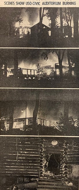 “Coeur d’Alene’s civic auditorium, which for the last three years had served as a USO center, was little more than a pile of smoldering ruins today, the result of a fire which broke out shortly before last midnight, and officers today said that they have uncovered sufficient evidence to indicate that the blaze was definitely of incendiary origin.”