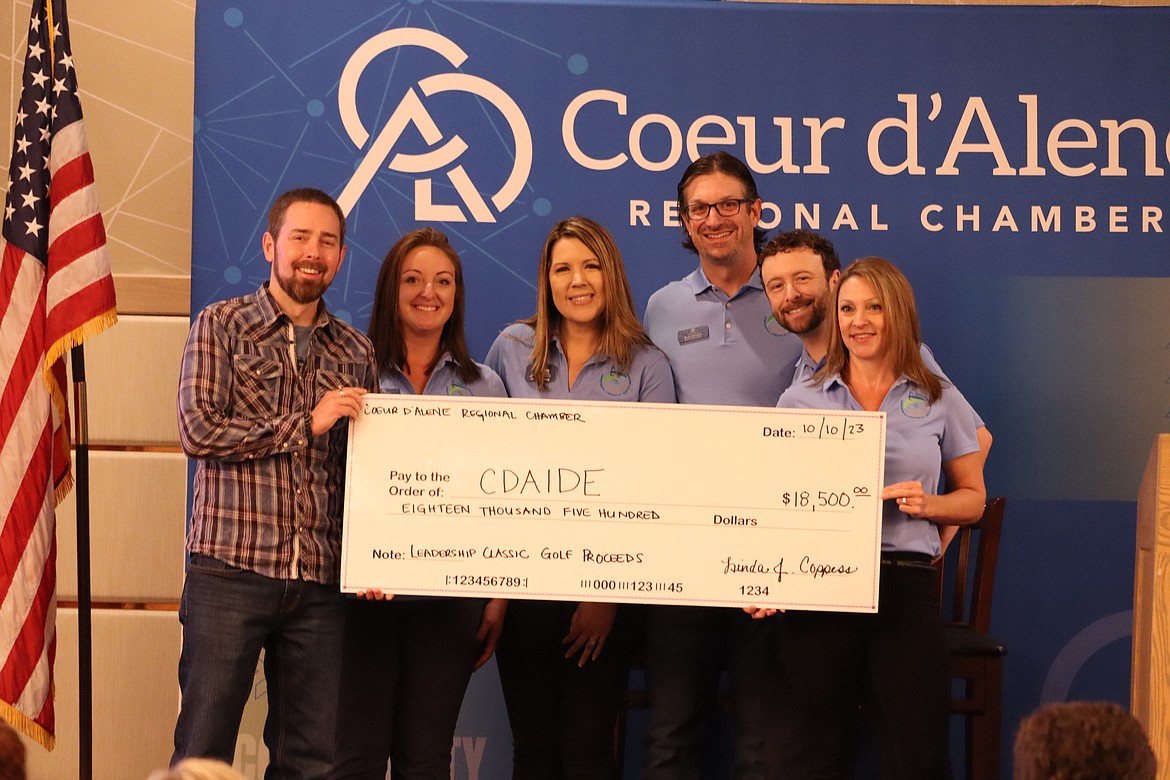 The Coeur d'Alene Regional Chamber recently donated $18,500 to the CDAIDE. The money was raised from its 2023 Leadership Classic Golf Tournament. From left: Jason Nye, CDAIDE executive director; and members of Leadership Coeur d’Alene, Vanessa Moos, Children’s Village; Jessica Long; Ryan Johnson, Architects West; Michael Armon, Stifel Investments and Naomi Boutz, Vine & Olive.