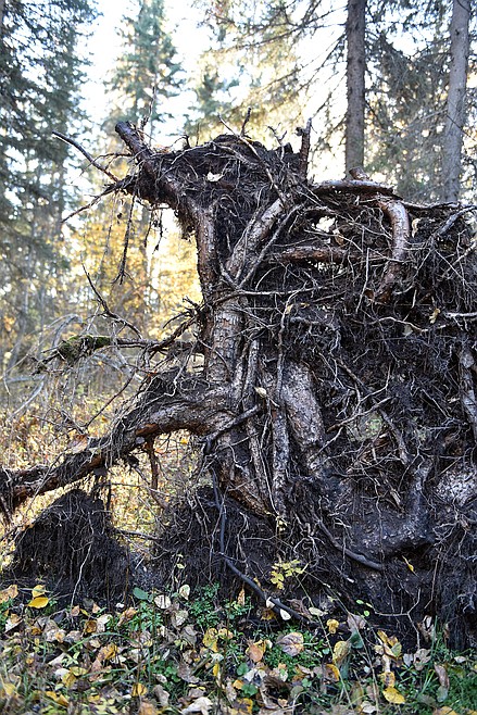 Once on the trail, the group of about 30 walked on crunchy leaves along the winding path and enjoyed the sights and smells of black cottonwoods, aspens, shallow-rooted spruce trees and western skunk cabbage.