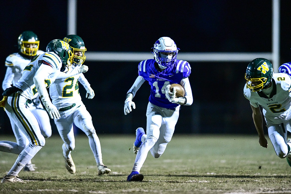 Columbia Falls wide receiver Jace Hill (14) picks up yardage after a reception in the first quarter against Whitefish at Satterthwaite Field on Friday, Oct. 27. (Casey Kreider/Daily Inter Lake)