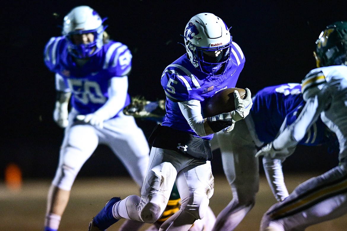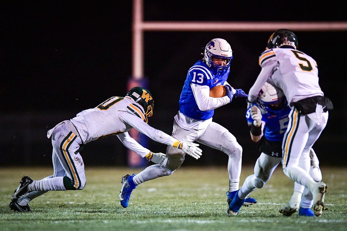 Columbia Falls running back Alihn Anderson (13) picks up yardage on a run in the first quarter against Whitefish at Satterthwaite Field on Friday, Oct. 27. (Casey Kreider/Daily Inter Lake)