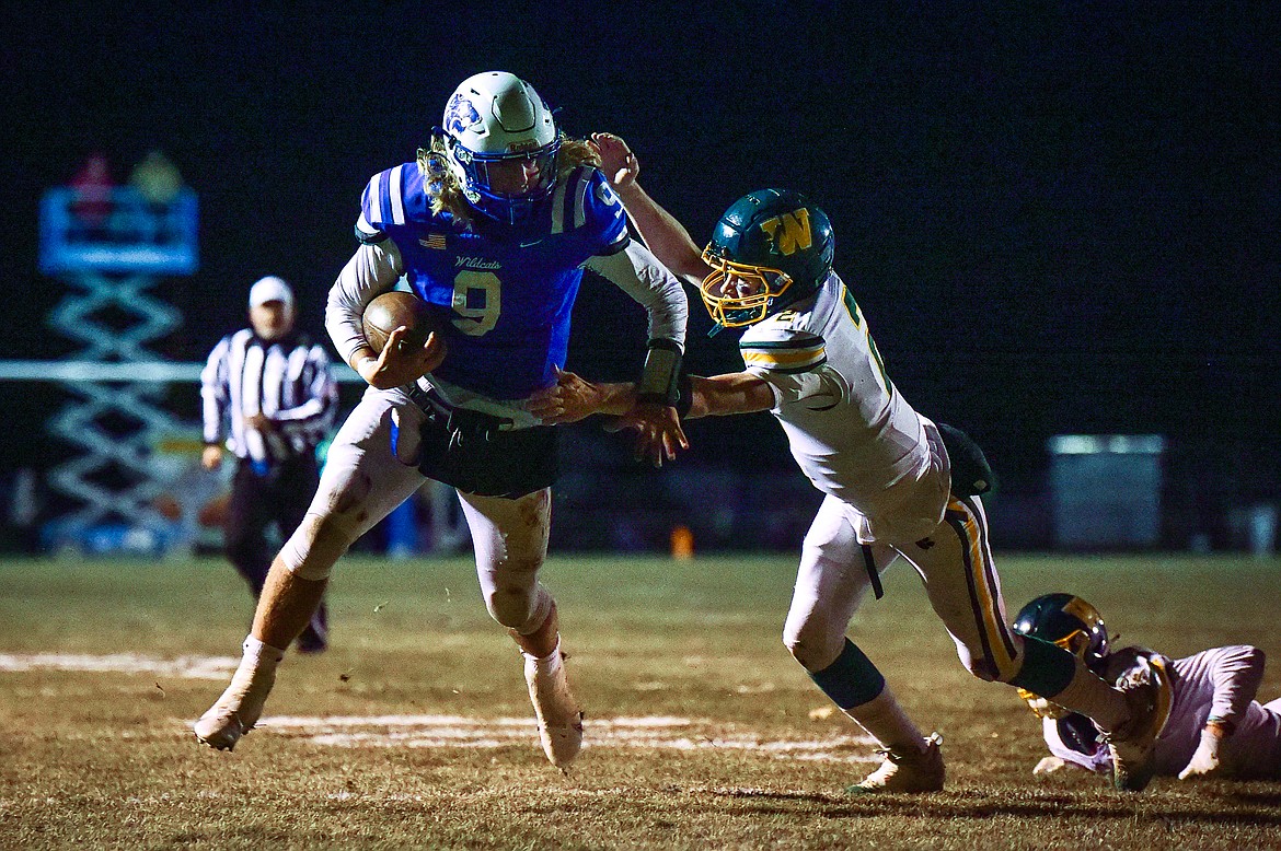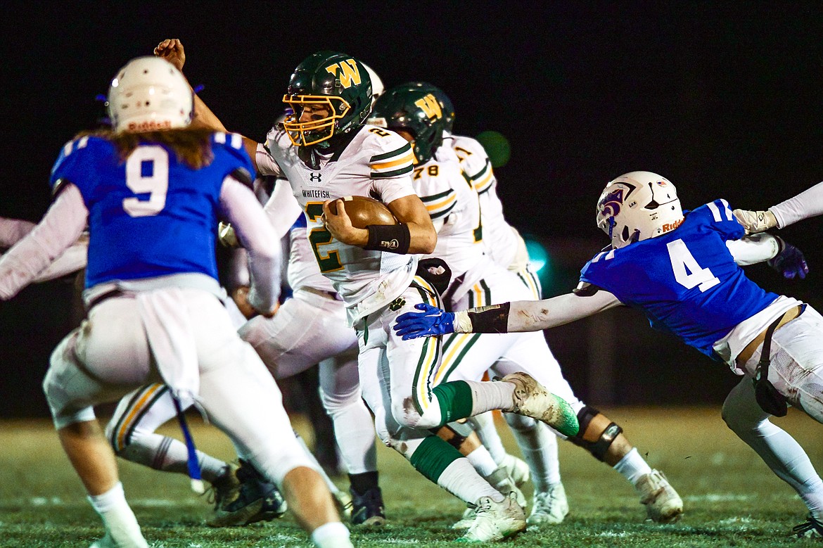 Whitefish quarterback Carson Gulick (2) picks up yardage on a run in the second quarter against Columbia Falls at Satterthwaite Field on Friday, Oct. 27. (Casey Kreider/Daily Inter Lake)