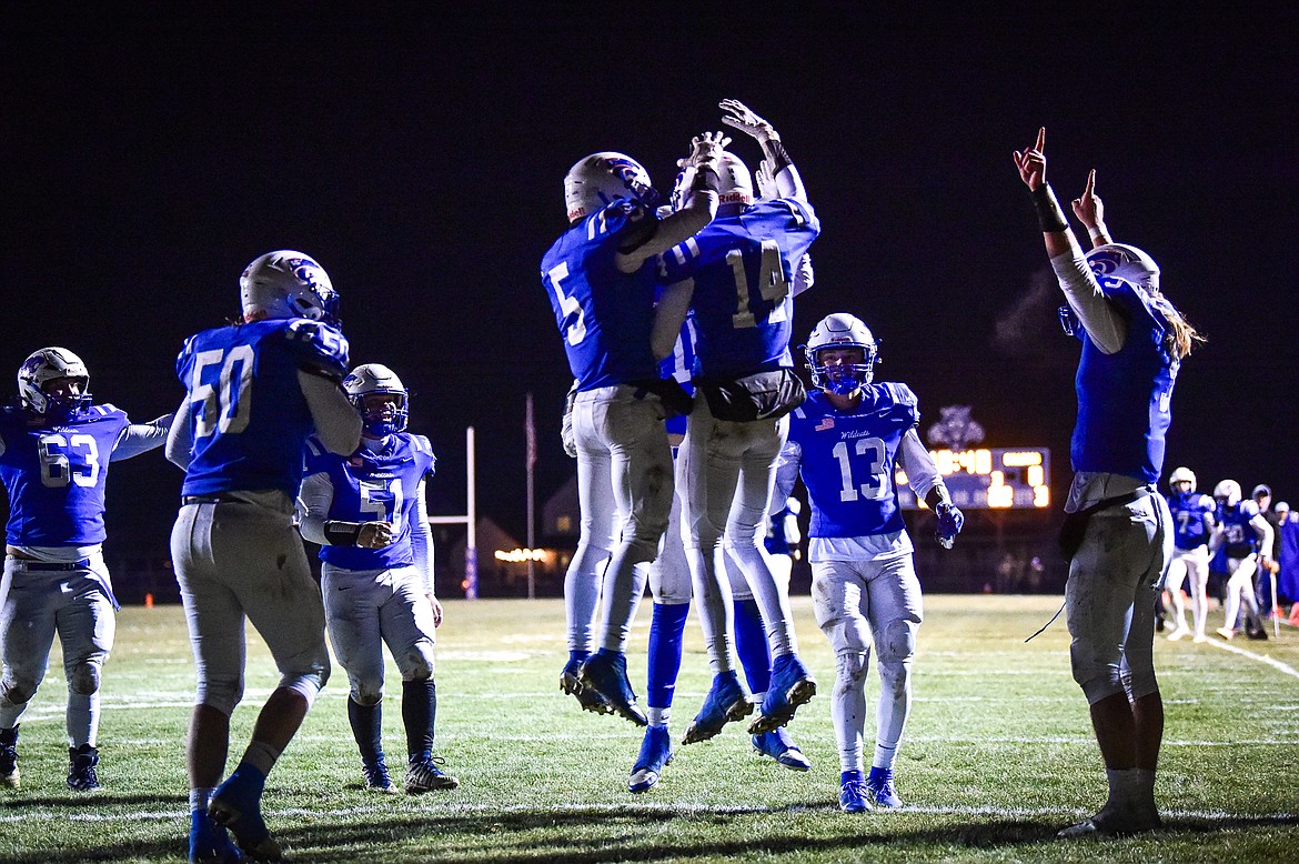 Columbia Falls celebrates after a touchdown reception by wide receiver Jace Hill (14) in the third quarter against Whitefish at Satterthwaite Field on Friday, Oct. 27. (Casey Kreider/Daily Inter Lake)