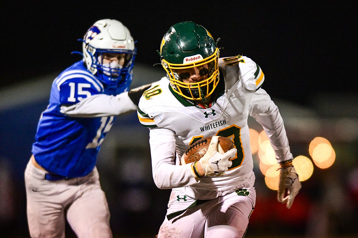 Whitefish wide receiver Mason Kelch (10) picks up yardage on a reception in the third quarter against Columbia Falls at Satterthwaite Field on Friday, Oct. 27. (Casey Kreider/Daily Inter Lake)