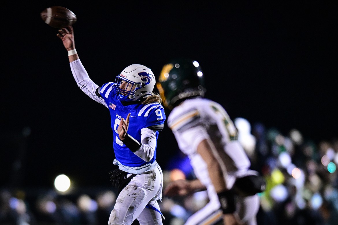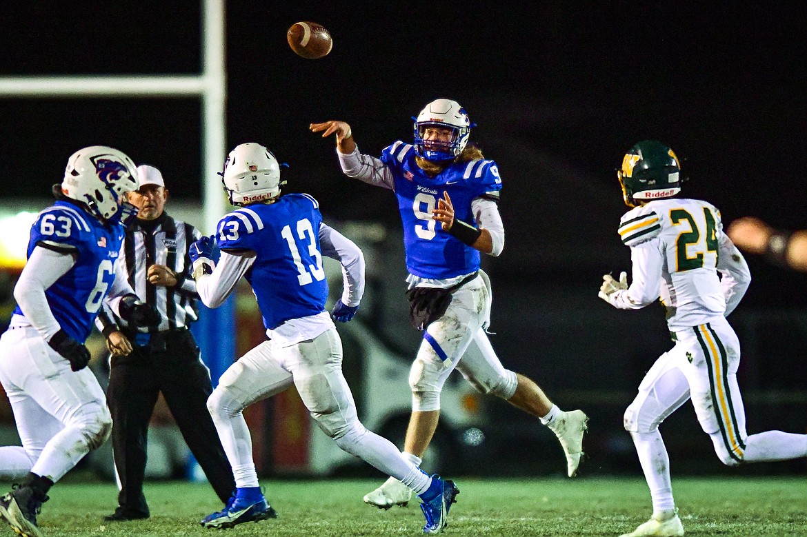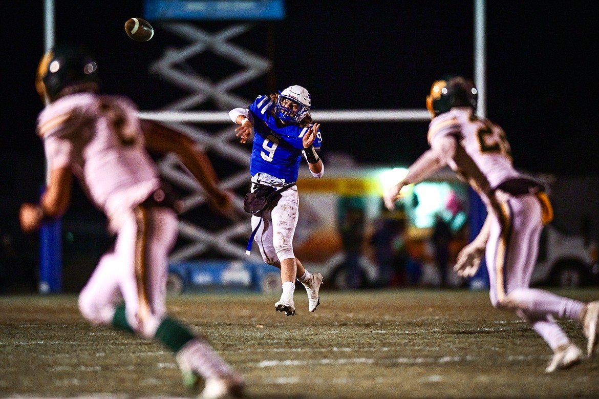 Columbia Falls quarterback Cody Schweikert (9) fires a pass downfield in the second quarter against Whitefish at Satterthwaite Field on Friday, Oct. 27. (Casey Kreider/Daily Inter Lake)