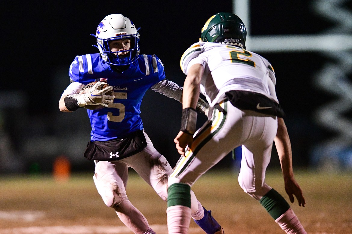 Whitefish wide receiver Dane Hunt (4) looks for running room after a reception in the third quarter against Columbia Falls at Satterthwaite Field on Friday, Oct. 27. (Casey Kreider/Daily Inter Lake)