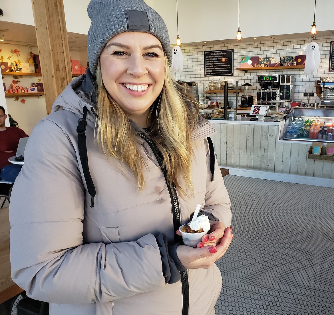 Gelato by the Lake manager Leah Roderick uses the opportunity to taste test for fall flavors. She likes the challenge of recreating the customer experience using an apple.