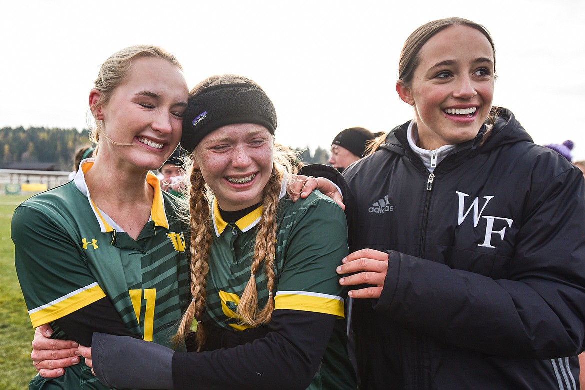 Whitefish's Georgia Morell (4), Olivia Genovese (10), Delaney Smith (9), Isabelle Cooke (20) and Macie Schmidt (7) celebrate after Smith's goal in the second half against Columbia Falls in the Class A state championship at Smith Fields on Saturday, Oct. 26. (Casey Kreider/Daily Inter Lake)Casey Kreider