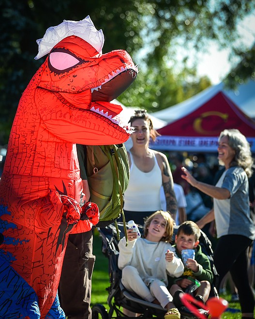 Kids smile at a costumed Tyrannosaurus rex at the Whitefish Community Foundation's Great Fish Fun Run in Whitefish on Saturday, Sept. 9. (Casey Kreider/Daily Inter Lake)