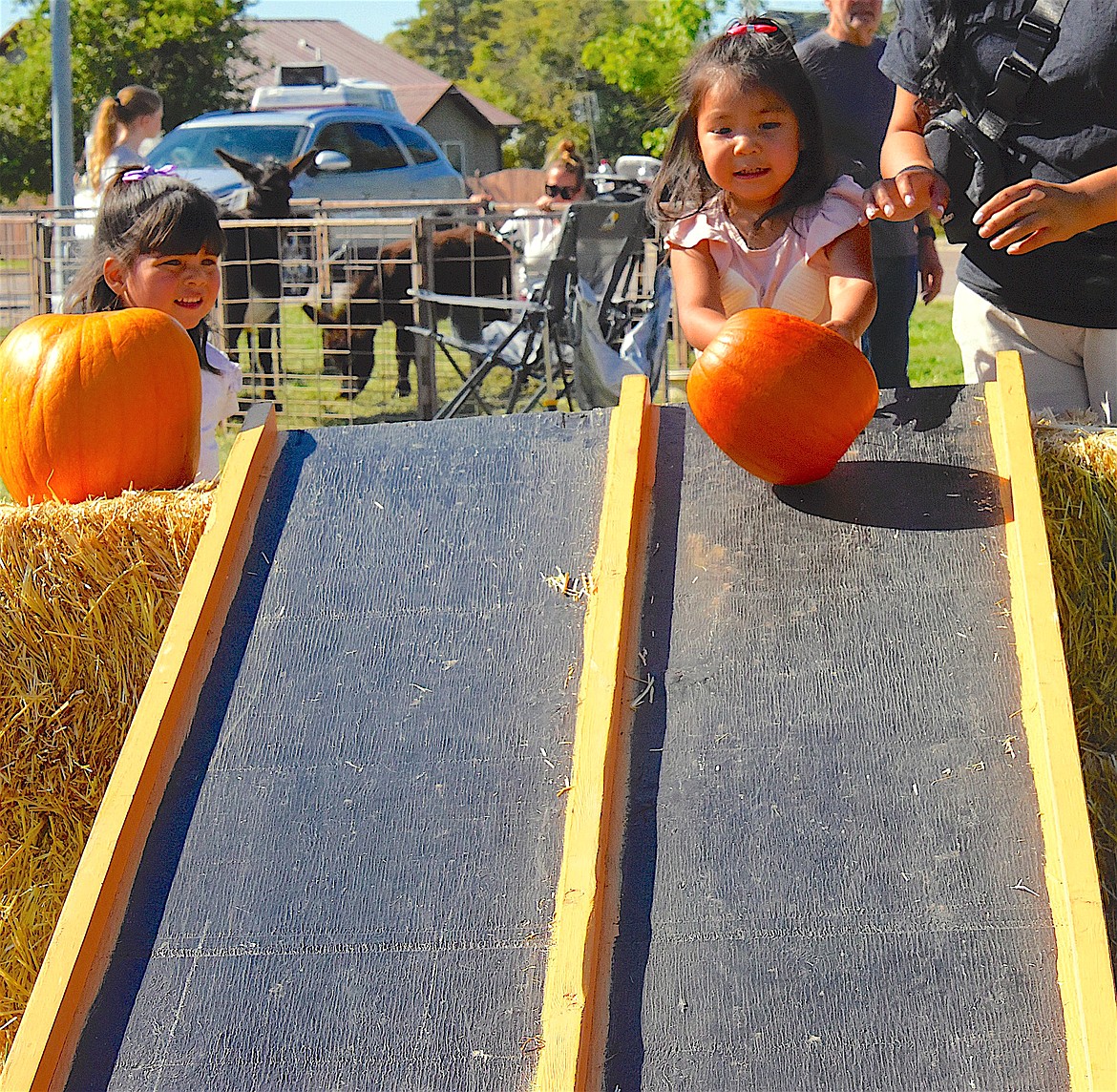 “I showed up to help, and this is where they put me,” Cantlon said, as he helped a toddler push a huge pumpkin down the slide towards the pins.