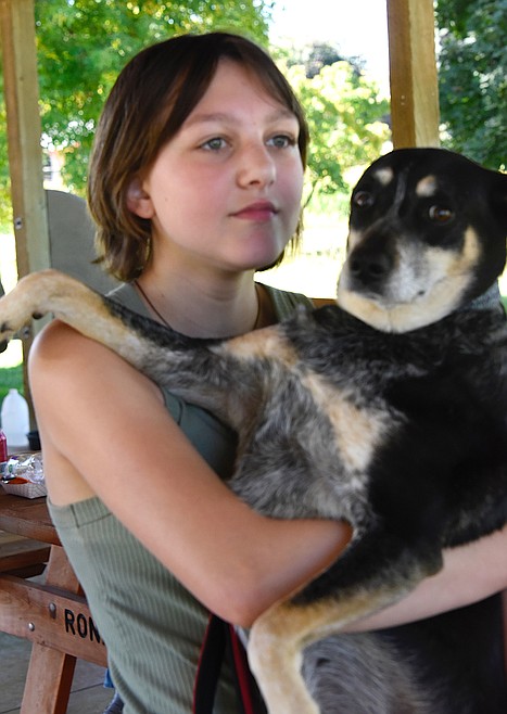 Lady relaxed in her owner’s arms as Kim and Bill Wright posed for a photo at the Lifesavers Animal Rescue barbecue on Sept. 16 in the pavilion at Ronan City Park. People who have adopted LSAR dogs were invited to the second annual event.