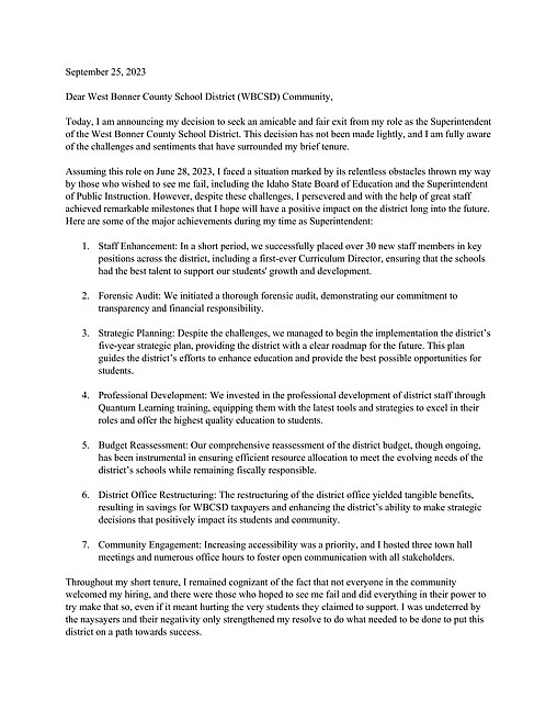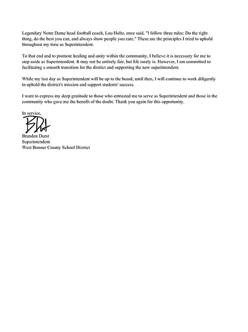 PRIEST RIVER — West Bonner Superintendent Branden Durst announced his resignation Monday and said he is seeking an "amicable and fair exit."