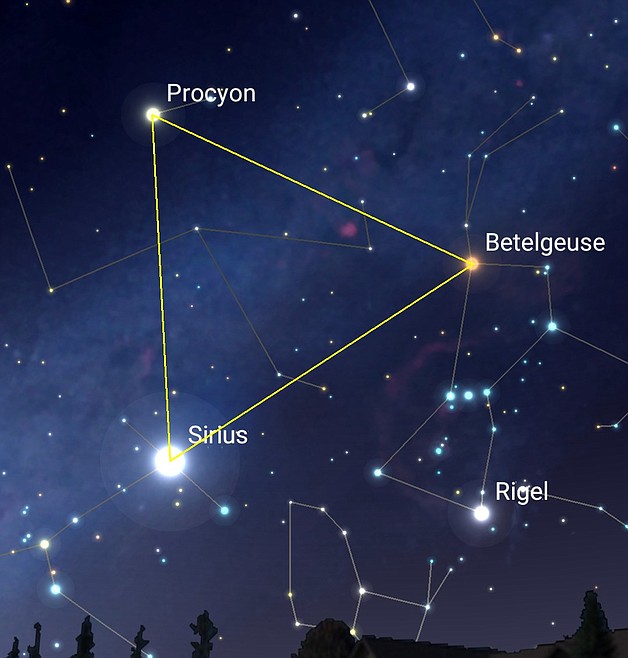 The Winter Triangle first appears in late evening during November. By the end of April, it will be disappearing into the western post-sunset twilight.