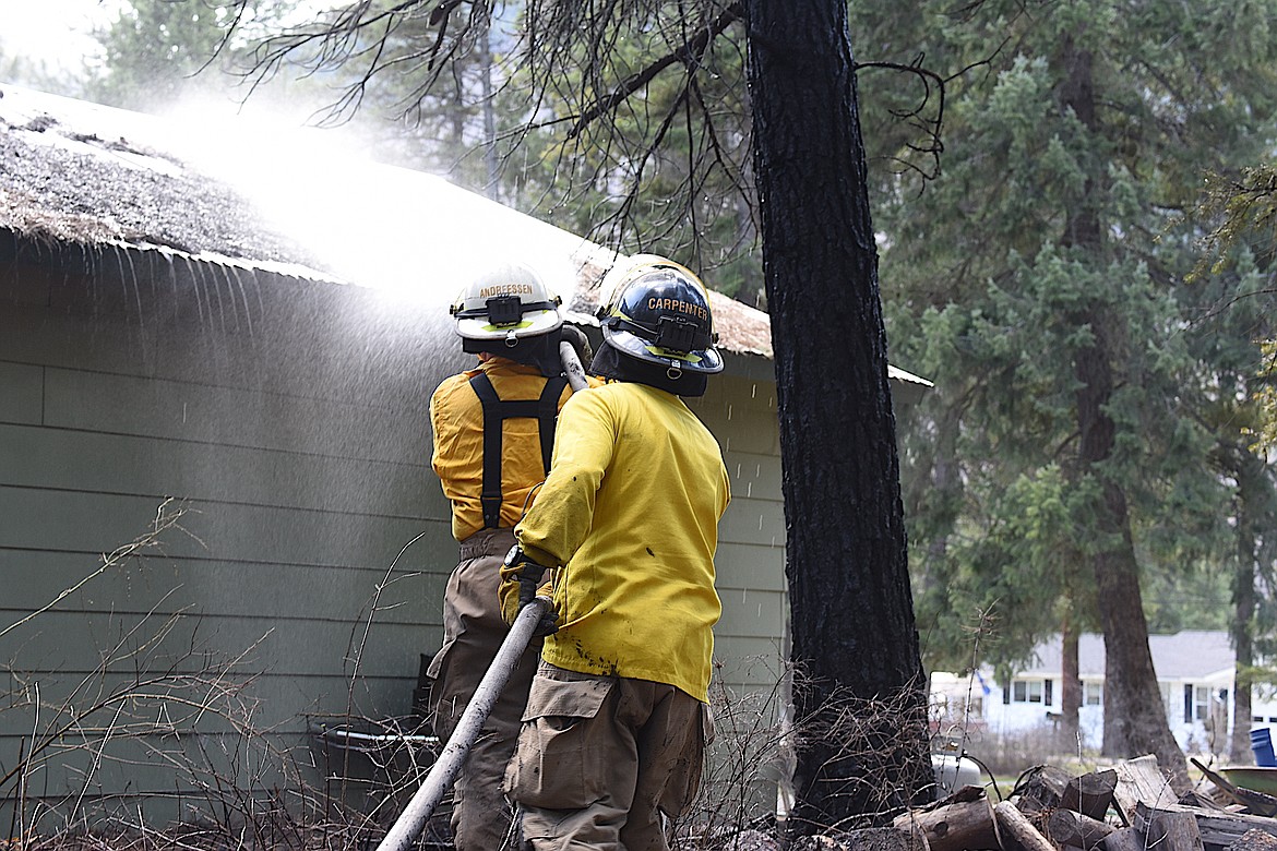 The volunteer firefighters heavily doused the burned areas as a nervous and grateful neighbor watched.