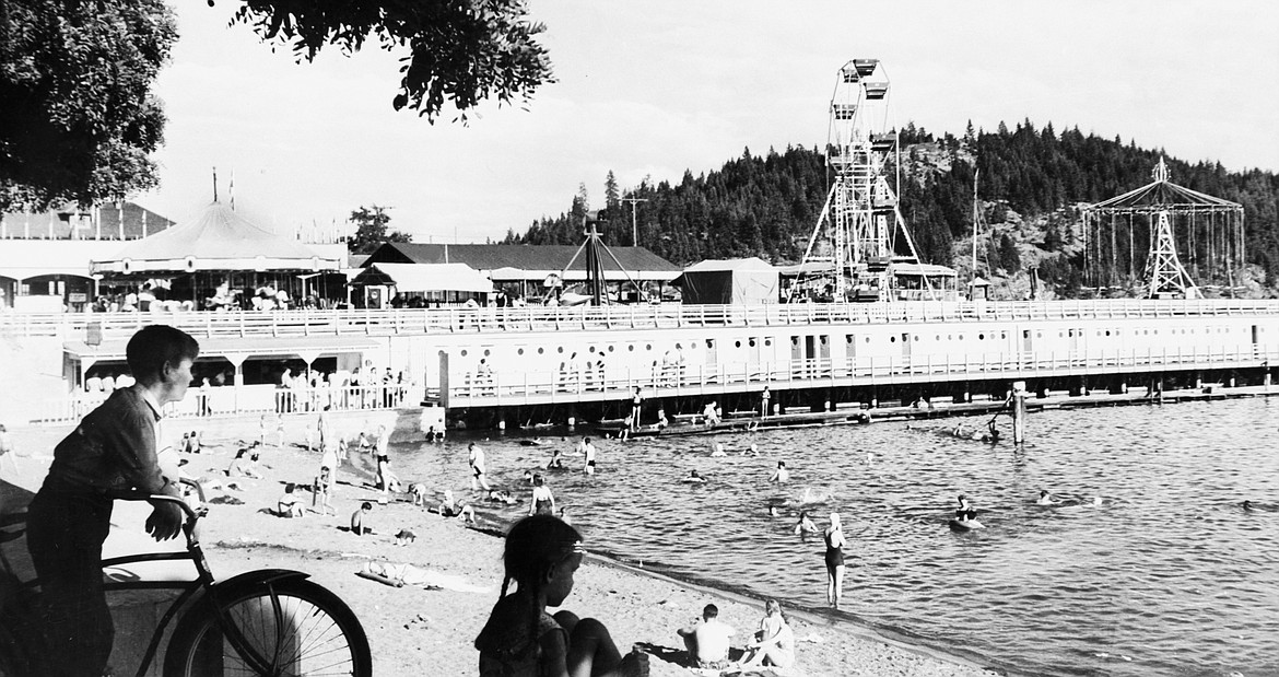 COEUR d’ALENE — A Ross Hall picture taken in 1947 shows a boy and girl sitting on the seawall at Coeur d’Alene’s City Beach. They seem to be looking at the rides of Playland Pier that once stood at Independence Point.