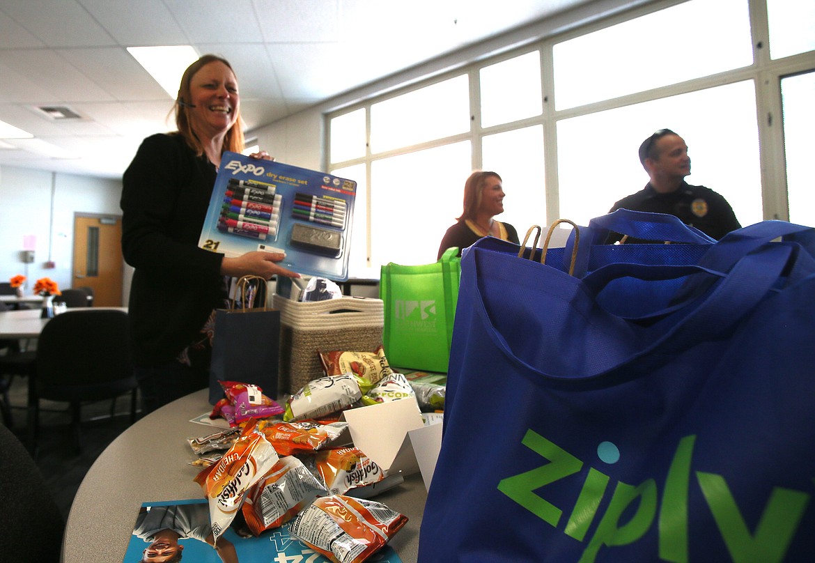 Christina Petit, Post Falls Chamber president and CEO, and other chamber members presented the schools with baskets containing gifts for everyone from teachers and administrators to bus drivers and custodians: snacks, doormats, stadium chairs, dry-erase markers, T-shirts and other swag, accompanied by handwritten notes of gratitude.