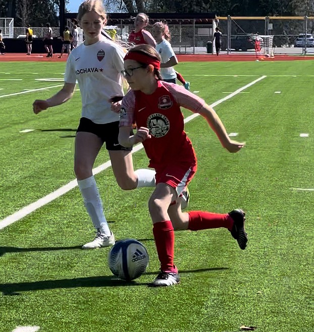 Photo by JULIE SPEELMAN Victoire James of the Thorns North FC 12 girls soccer team dribbles down the field in a recent game against the Sandpoint Strikers FC in Sandpoint. The game ended in a 1-1 tie, with Elle Sousley scoring for the Thorns.