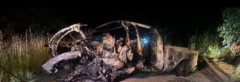 The vehicle, tentatively identified as a newer GMC 1500 pickup, was severely damaged. "The frame is still there, but the doors have melted and vanished. We didn't know where the car doors were, initially," Miller explained.