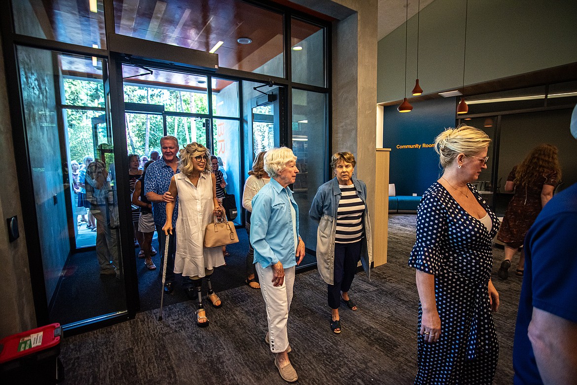 Bert and Kari Arnlund (far left) are among the first to visit the new Bigfork Library during its grand opening Tuesday, August 6. The library's community room will be named after the Arlunds following a closing donation from the couple, bringing the total capital campaign to $3.2 million. Over 420 individual donors contributed. Other named areas include AGL Foundation Children's Area, Laura Long Community Patio, and Laura G. Barrett Reading Room. (Avery Howe/Bigfork Eagle)ARTICLES BY TAYLOR INMAN