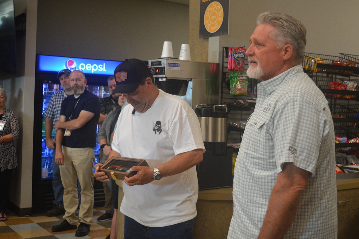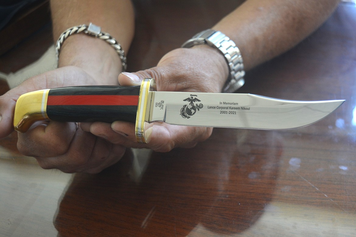On Thursday, Nikoui spoke to Buck Knives workers, and CJ Buck presented him with a knife made to commemorate Kareem’s life. The blade is a Buck 119 knife bearing the colors and emblem of the United States Marine Corps.