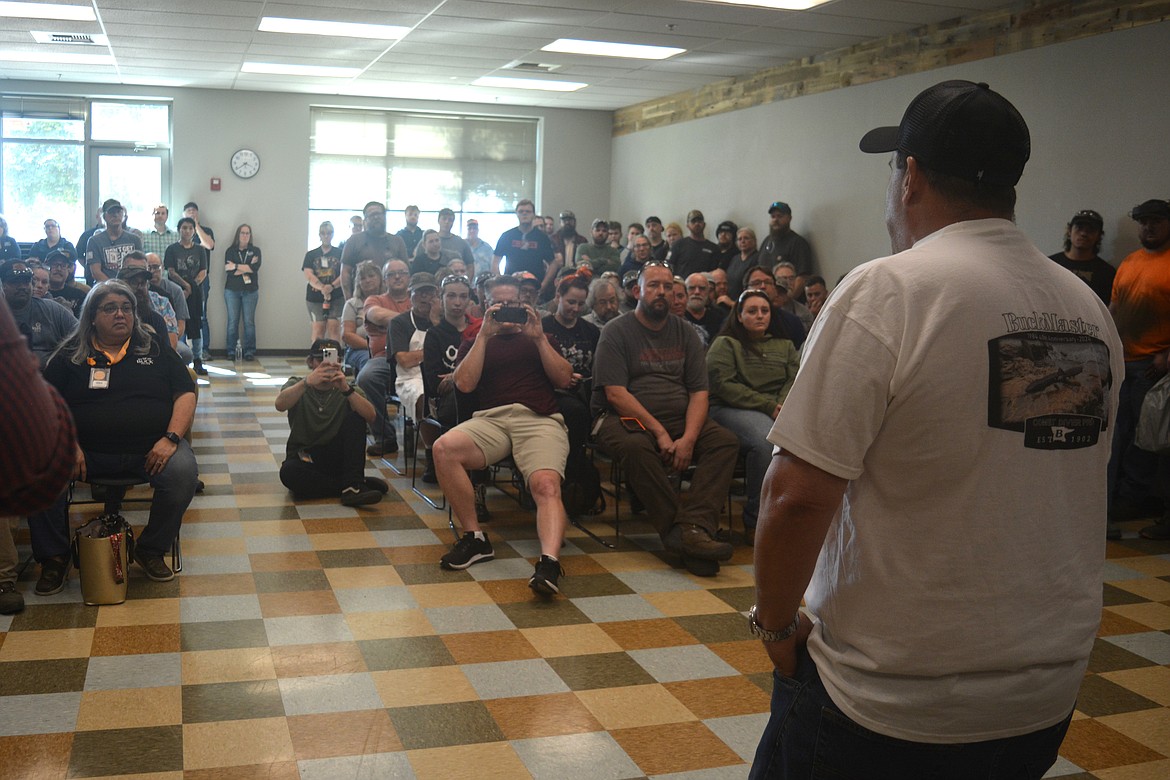 Steve Nikoui addresses staff at Buck Knives in Post Falls to tell the story of the connection he and his son, Kareem Nikoui, had to knives from the company. Kareem Nikoui was a Marine killed in Afghanistan almost three years ago and Steve Nikoui gave his son the automatic Buck 110 knife when he was deployed due to its versatility and ability to be opened one-handed.ARTICLES BY CAROLYN BOSTICK