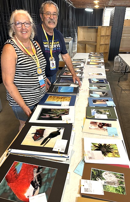 In the art and photography building, longtime superintendents Ken and Elaine Cook are in the early process of arranging photographs, with many laid out on a table.