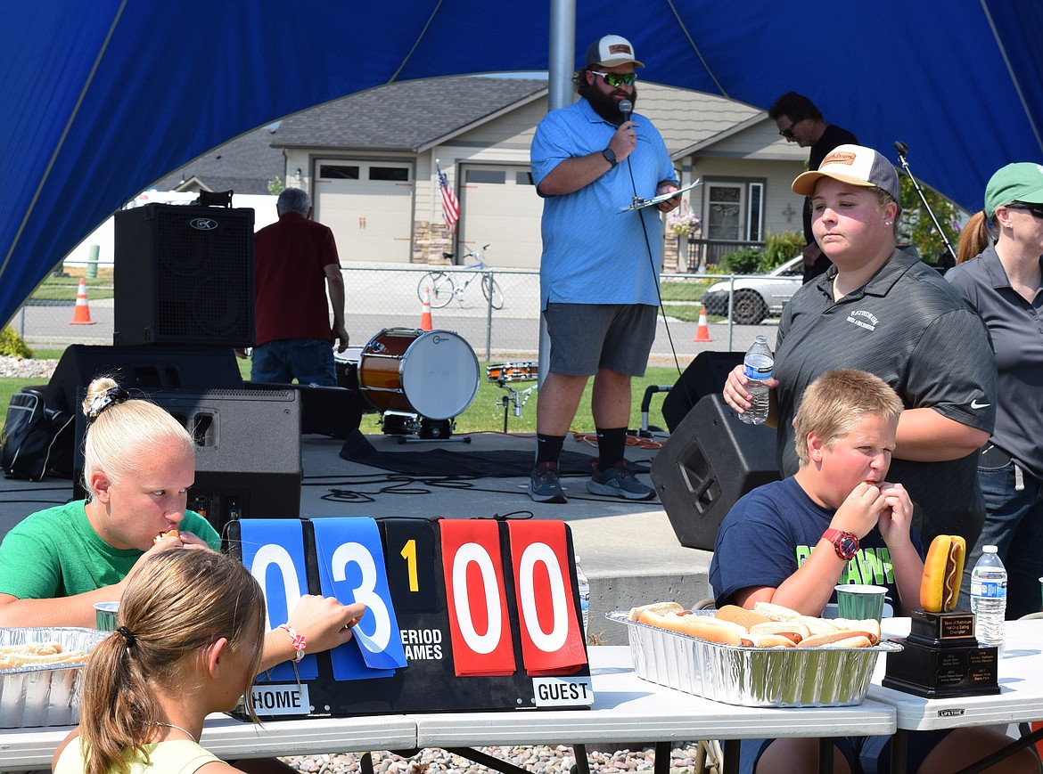 Contestants had five minutes to wolf down as many hot dogs — complete with hot dog buns — as possible, aided only by water. Hot dogs and buns for the contest were provided by Super 1 Foods. Dozens of family members cheered contestants on from the grass as they enjoyed food and drinks from local vendors.