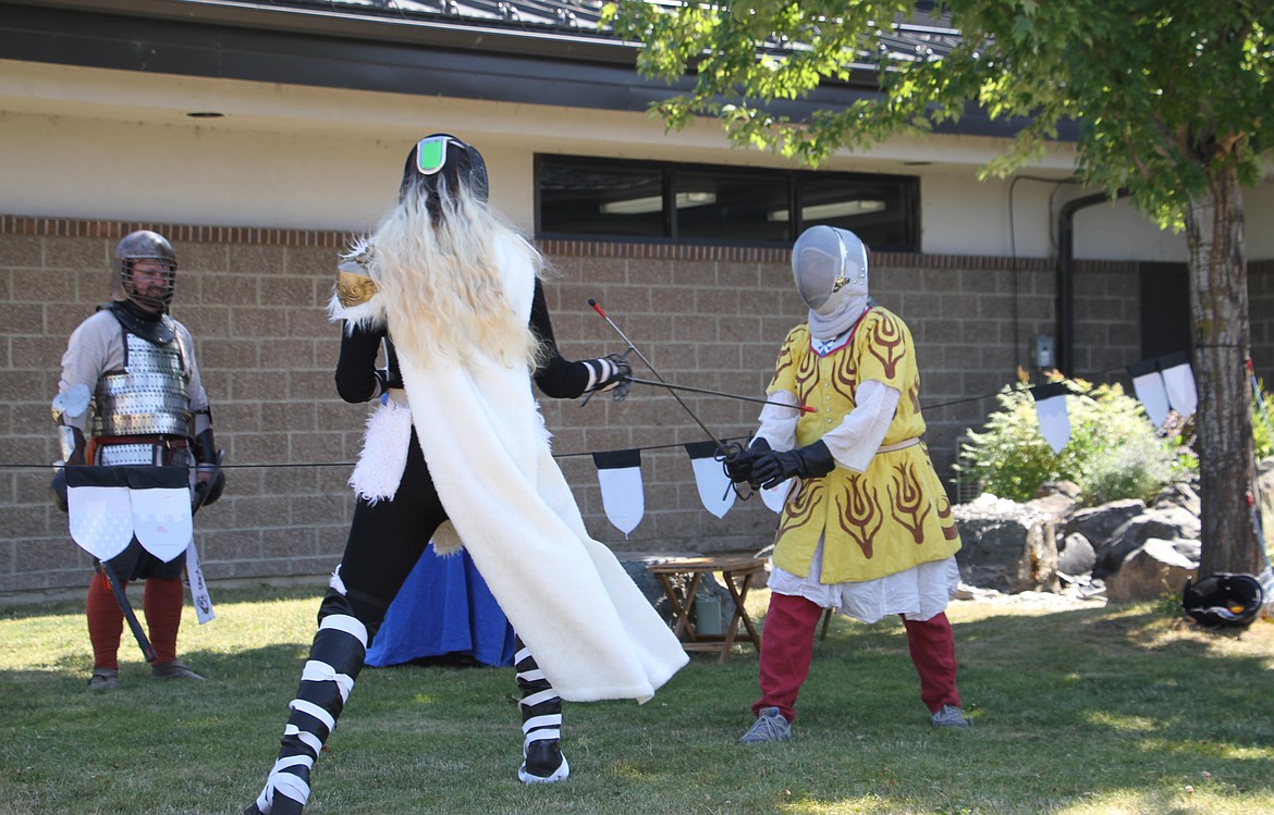Members of the Barony of Wealdsmere, a branch of the Society for Creative Anachronism, demonstrated the medieval battle techniques of rapier fencing and heavy fighting.