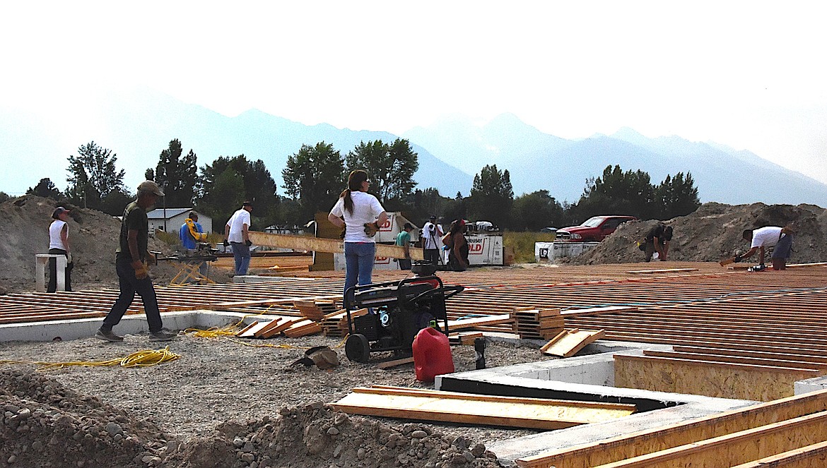 From 30 to 40 volunteers were swarming the building site for Jake's House the weekend of Aug. 9-11. They were carrying boards, sweeping concrete, putting in floor joists, wheeling equipment around the site and installing a subfloor.