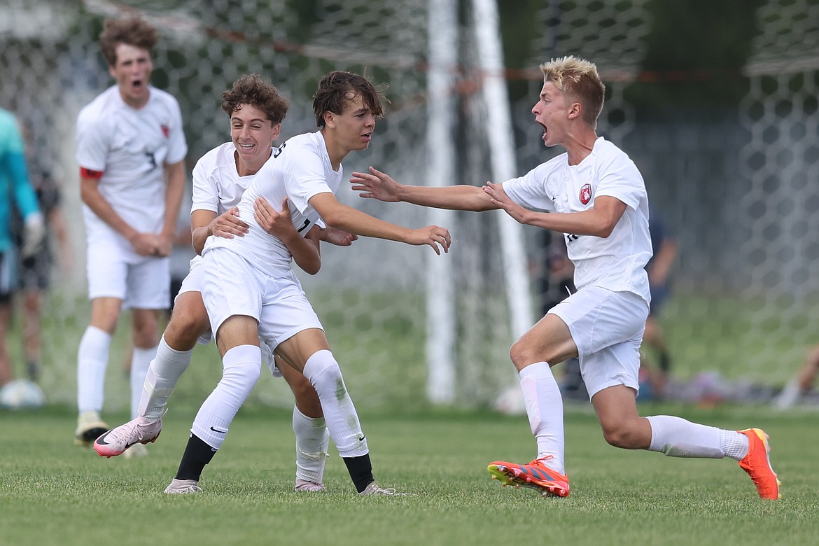 A junior, Jack, with the Bulldogs trailing Lake City 2-1 with less than two minutes remaining, scored on a half-volley from 25 yards out that went directly into the top left corner of the net. Pictured, from left are Luke Leavitt, Lorenzo de Luca, Treman, and Huxley Hall, who was credited with an assist on the play, celebrating seconds after the goal was scored.