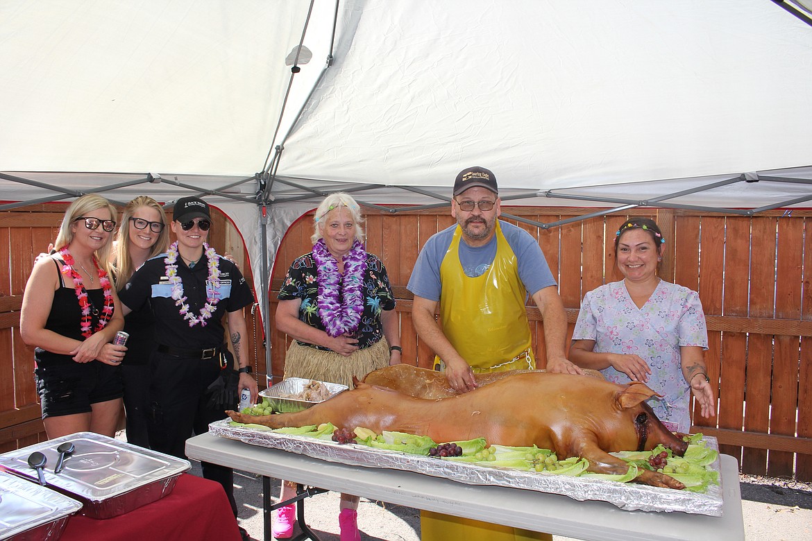 Hawaiian leighs, colorful punches, grass skirts, live music, Tiki candles, and umbrellas delighted the 11 residents who live in LTC at MCH and most have family nearby that came for the festivities. Superior Meats roasted, delivered and carved the pig with side dishes from the MCH kitchen that included Mustang Sally, bacon wrapped dates, baked asparagus, frog eyed salad and others with two large, themed cakes that most took a slice to-go.