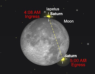 At nightfall, low in the east-southeast, take note of Saturn positioned about a half-dozen degrees to the left of the nearly full moon. During the overnight hours, the moon will slowly advance toward Saturn at a rate of roughly its own diameter per hour. By a little after 4 a.m. the following morning, the moon will cover (occult) Saturn.