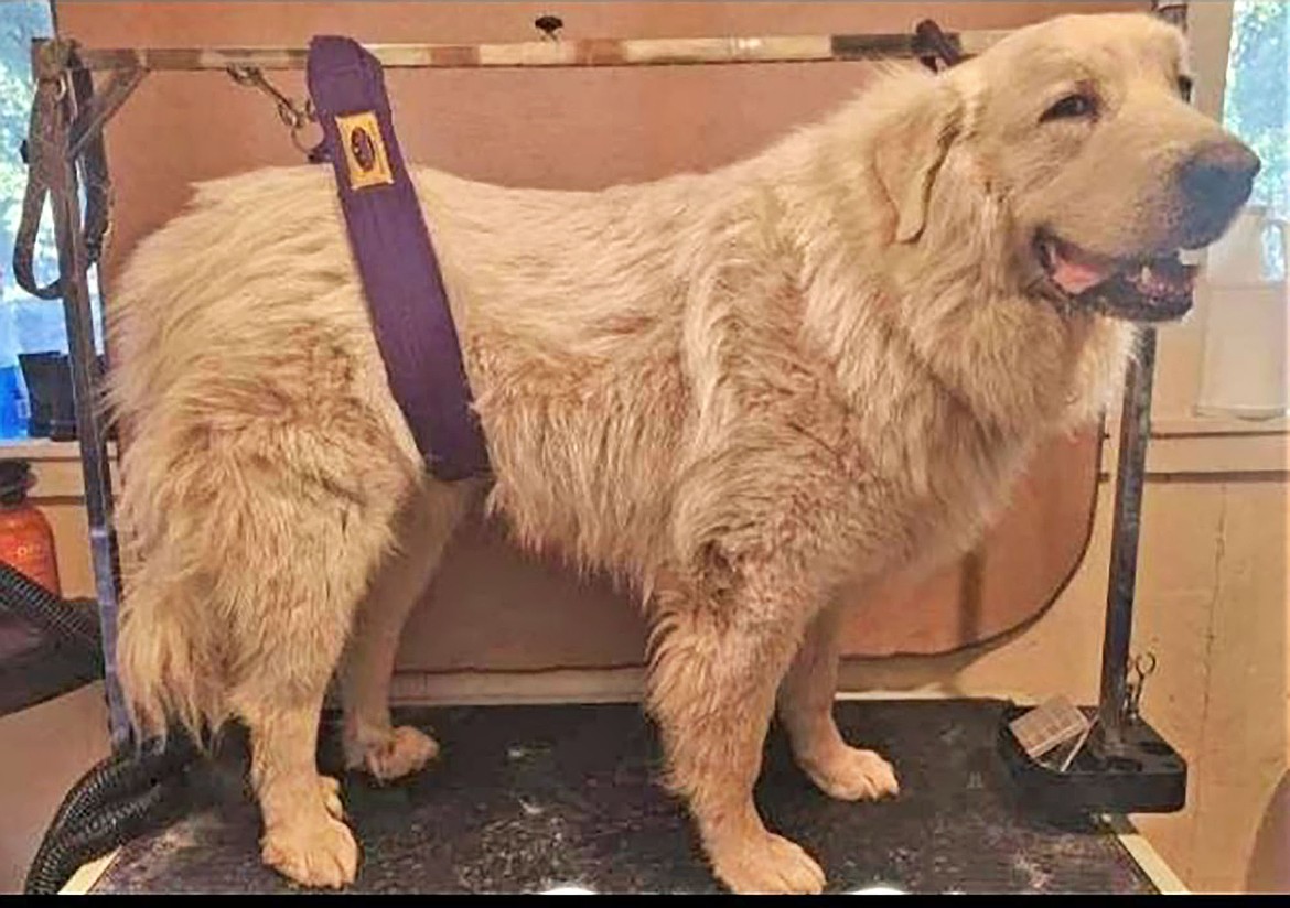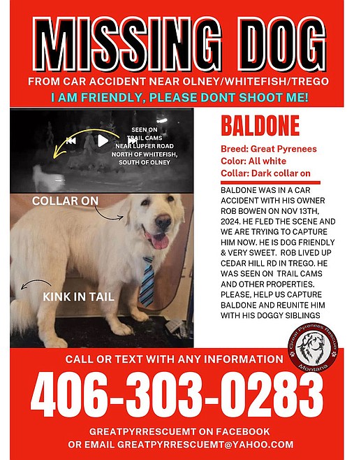 Great Pyrenees Baldone, a large fluffy white dog, was riding in the truck with his owner, Rob Bowen, when the two suffered an accident on U.S. 93 north of Whitefish on Nov. 13.