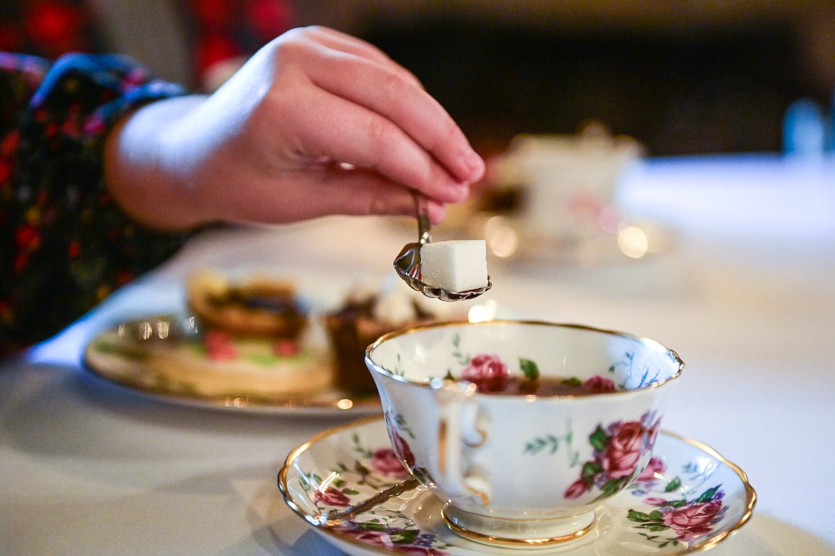 An attendee adds a sugar cube to a cup of tea during a Christmas Tea Party & Tour at the Conrad Mansion Museum on Saturday, Dec. 14. (Casey Kreider/Daily Inter Lake)