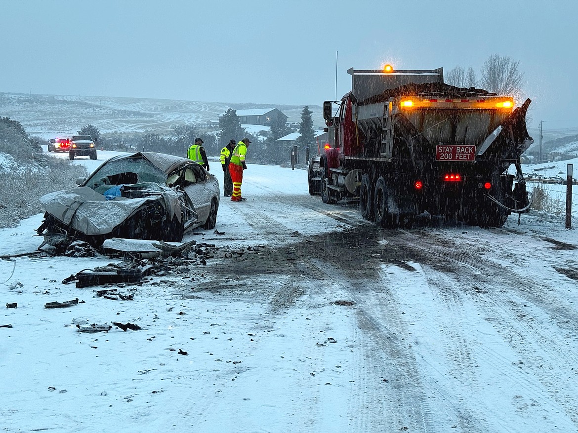 “The collision captured in the photo (we released) represents exactly what can happen on a snowy or icy road,” Grant County Sheriff’s Officer Kyle Foreman said. “In this case, the car’s driver was driving way too fast, lost control, and slammed into a snowplow. The car’s driver was lucky he was not seriously injured or killed, and the plow operator was lucky as well.”