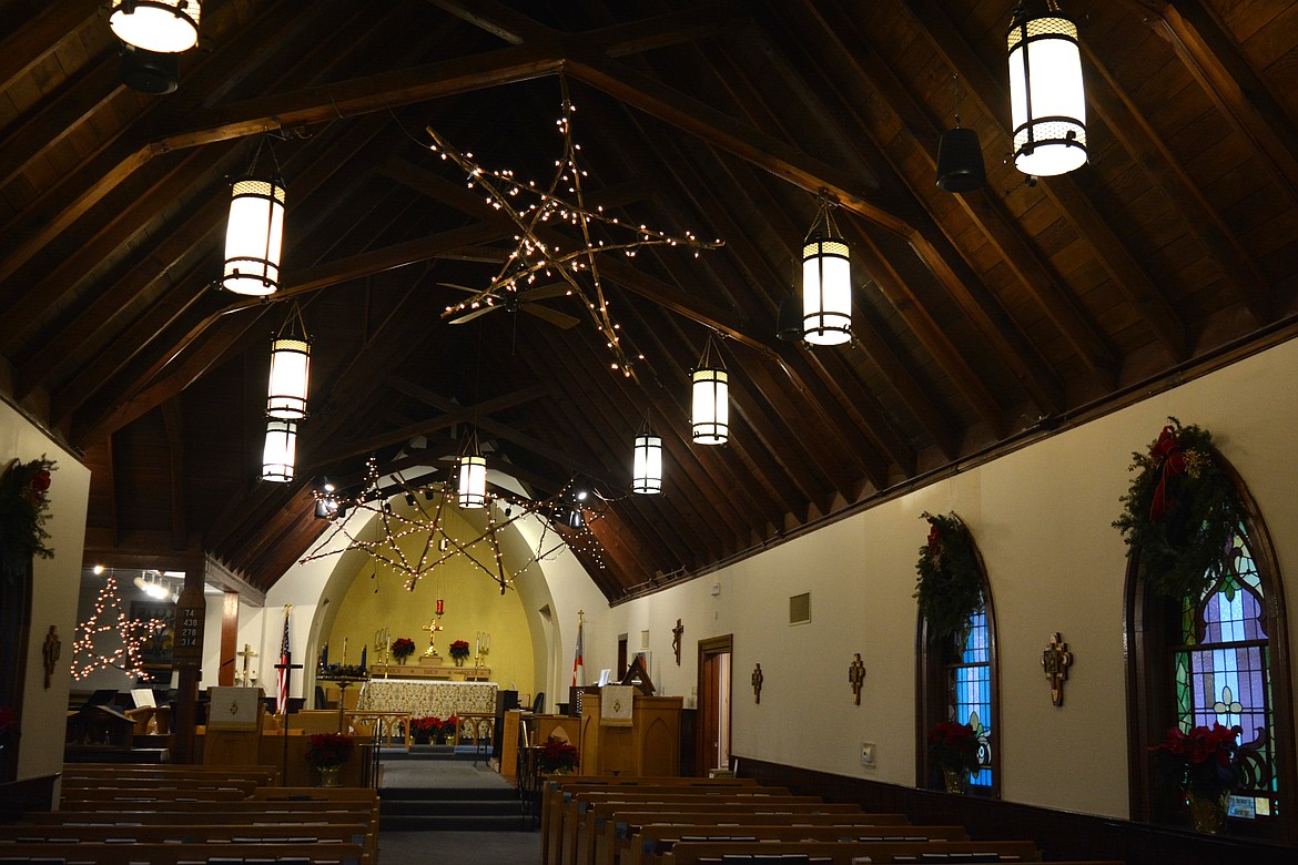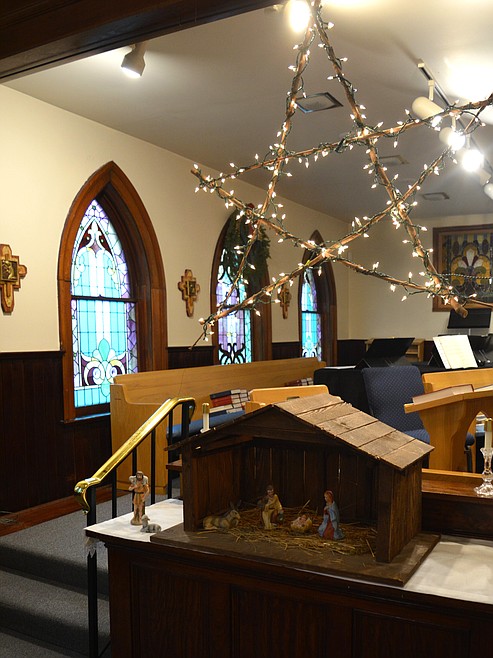 The wooden stars alight with small lights that lead the eyes down the aisles of the 132-year-old church and up to the sanctuary and the small nativity scene displayed in front for the congregation.