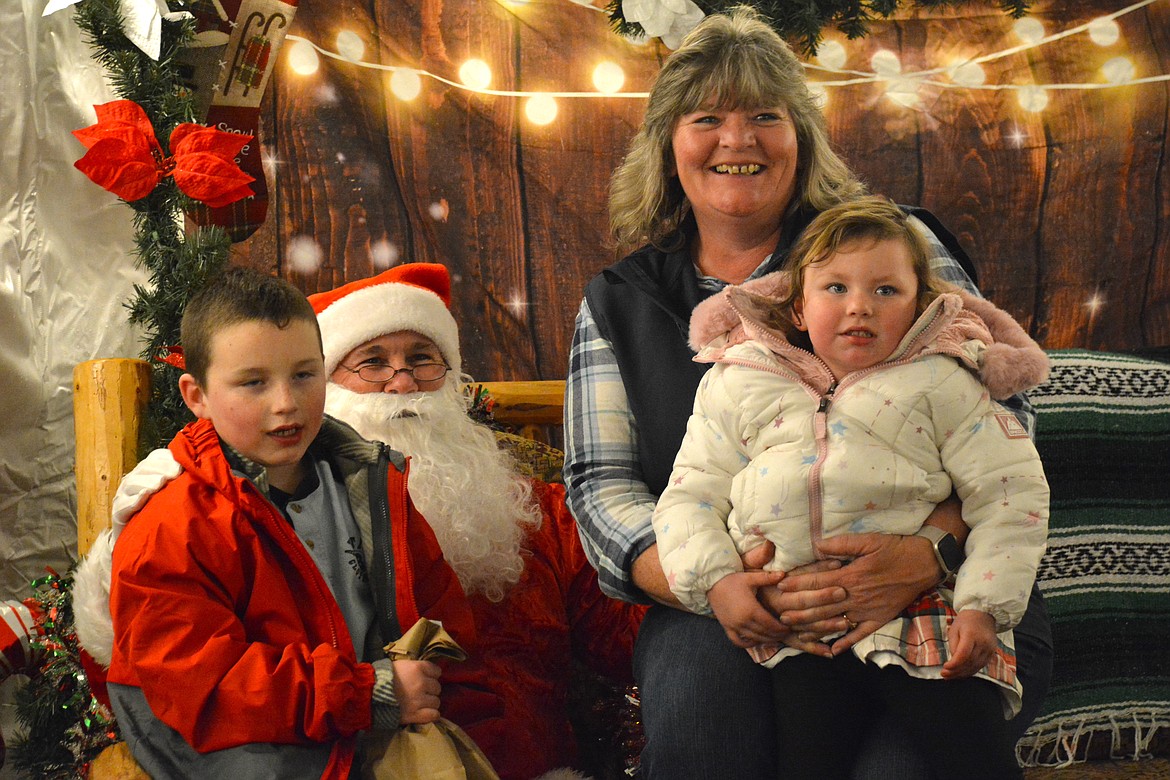 The courthouse lawn was adorned with a giant blow-up Santa, a massive snowman, a fluffy blow-up igloo, and dozens of twinkling lights. Children and families climbed the decorated stairway up to Santa Claus to tell him their wish lists and received goodie bags generously donated by Craig and Deb Sheppard.