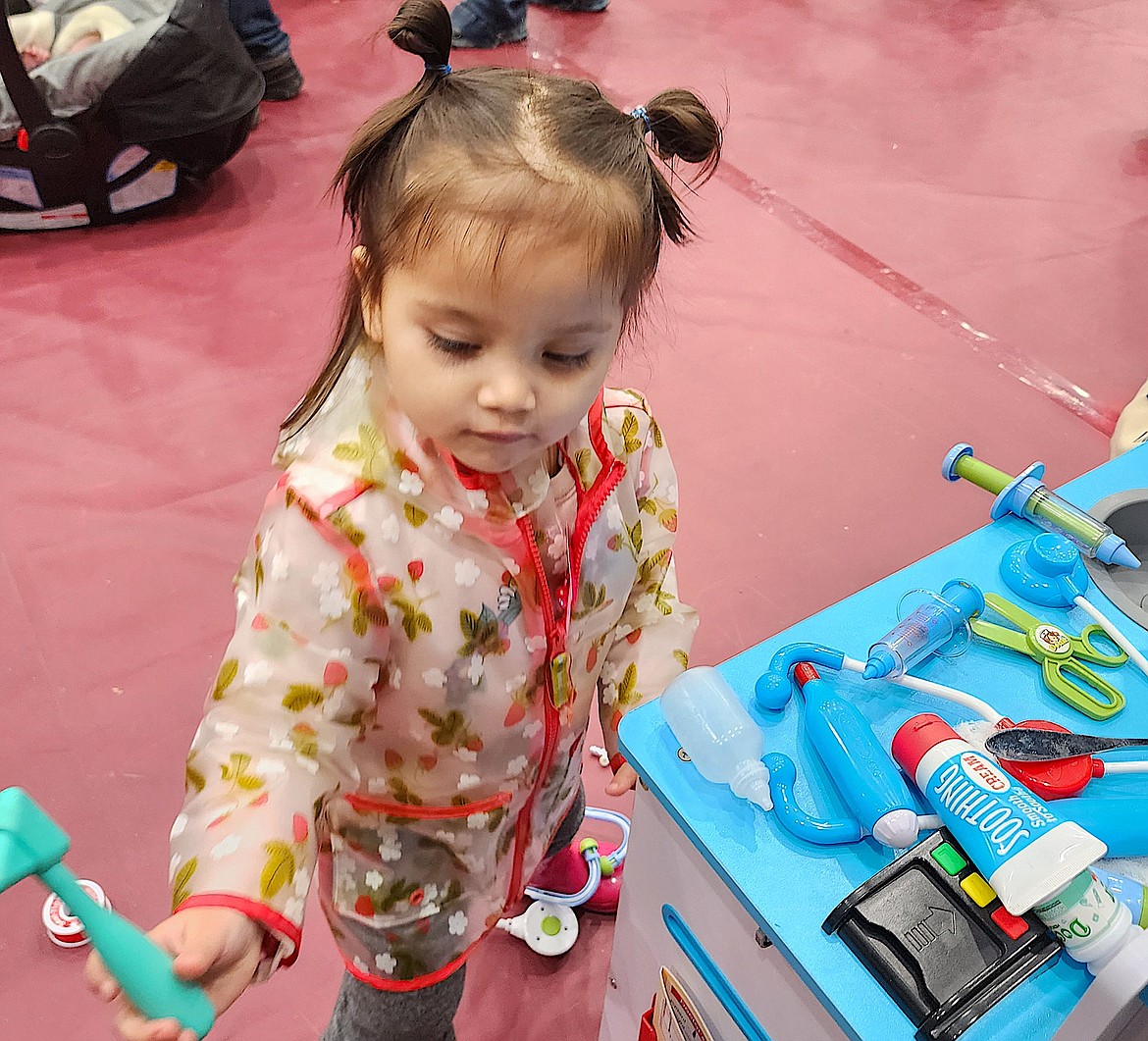 The entire floor of the Joe was covered with tables stocked with children’s books, games for kids, and information for grown-ups. Offerings included deep tissue massage on the mezzanine for parents, eye checks for kids, free haircuts, plus play spots for kids to expend energy and a table for parents to pick up clothes for little people.