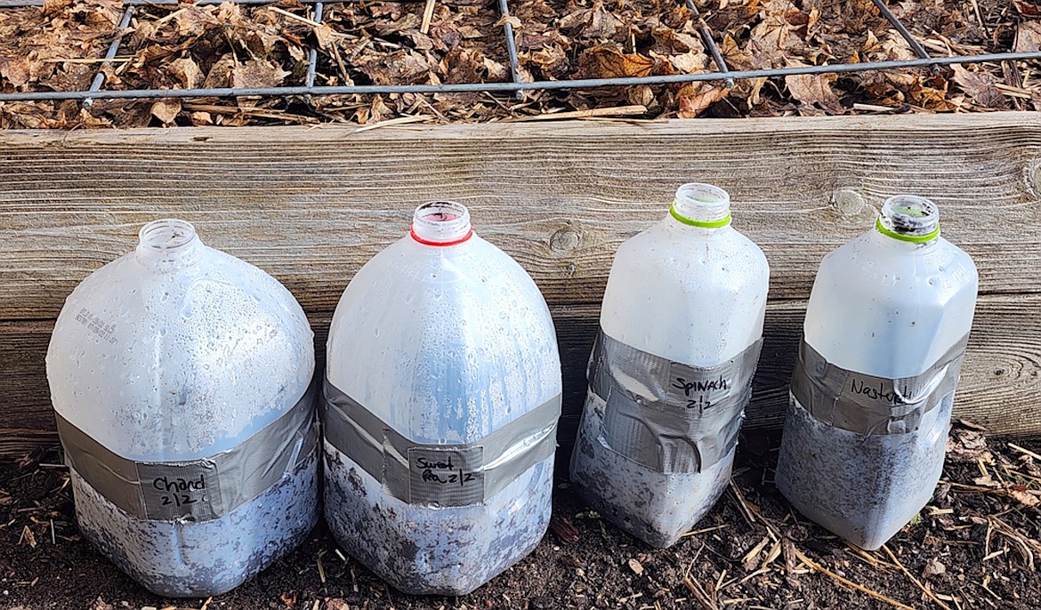Place the jugs outside where they will receive moisture, but somewhat protected from wind. An eastern exposure with morning sun and some afternoon shade works well. This positioning will provide enough warmth for germination, but will help avoid scorching tender seedlings when temperatures start to warm up.