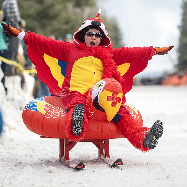 Bar stool ski racers make their way down Sugar Hill in Martin City for Cabin Fever Days Saturday, Feb. 10. Fifty-six racers participated, and an estimated $10,000-plus was raised for Badrock Canyon first responders. (Avery Howe photo)