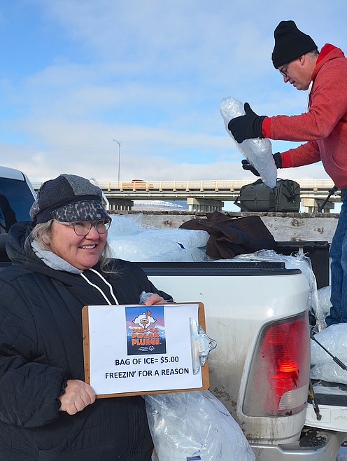 In order to better emulate river temperatures on the sunny 25-degree afternoon, Gloria and Chris Richards sold bags of ice for $5 each. Gloria held a sign reading “Freezin’ for a Reason,” and collected donations while Chris broke open the bags, donated by Missoula’s VW Ice, and tossed them in the pool.