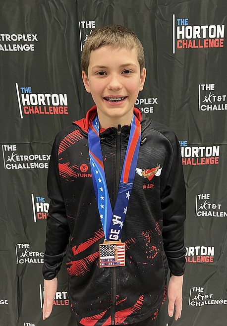 Courtesy photo Avant Coeur Gymnastics Level 9 boys at the Horton Challenge in Texas. In the front is Dylan Coulson; and back row from left, coach Matt Auerbach, Lance Mosher, Felipe McAllister and Conan Tapia.