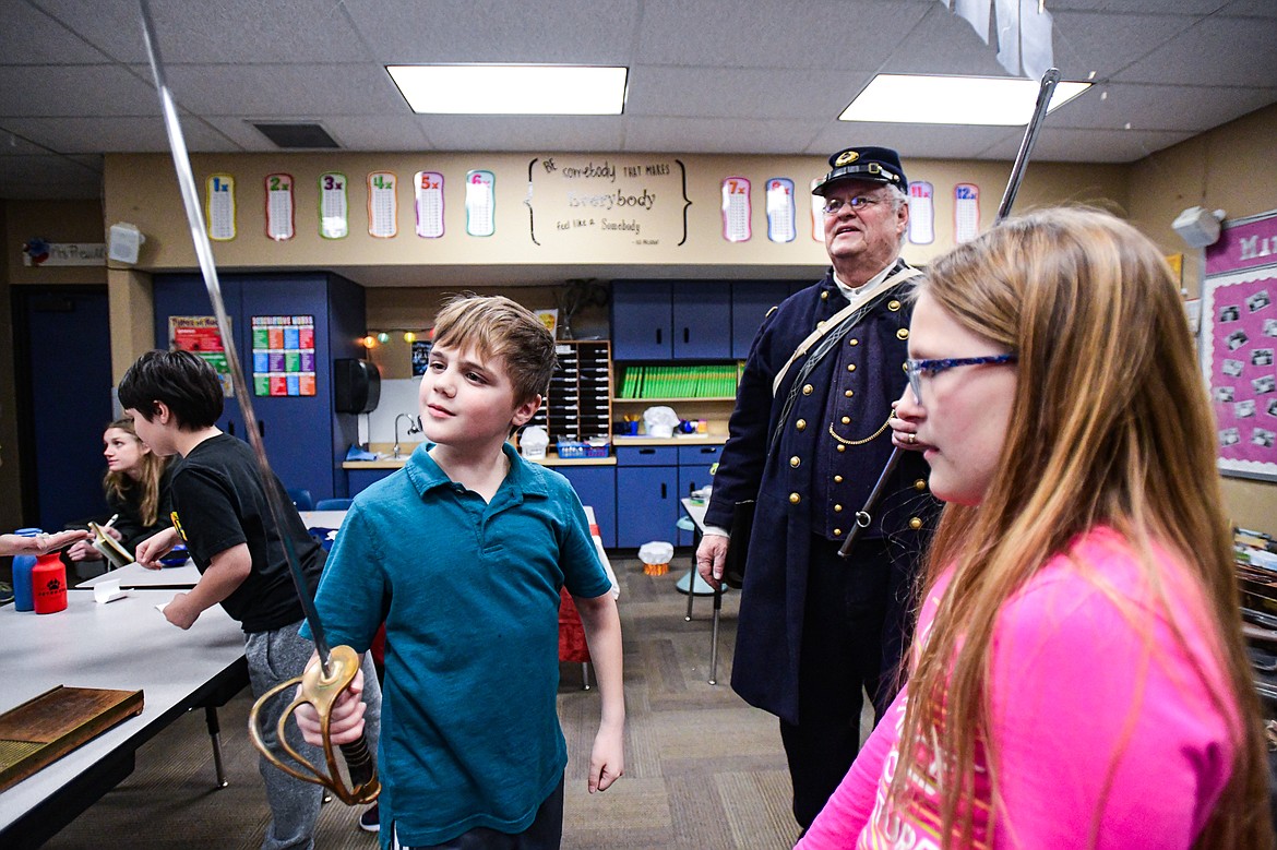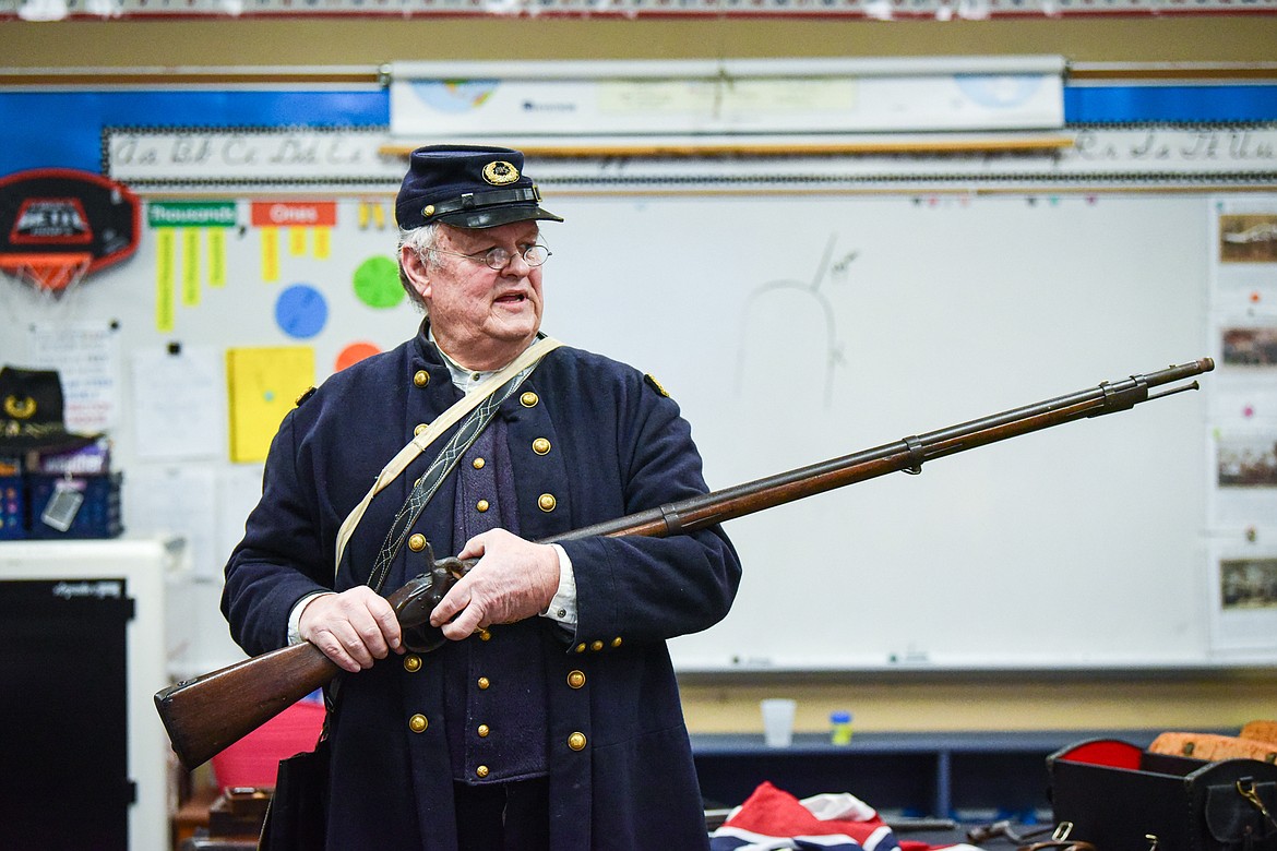 The coat belongs to Mike Inman, historian and American Civil War reenactor, who stands at the front of the classroom in his own Civil War-era medical outfit. Inman, who lives in Spokane, traveled to Kalispell to teach the students about the 1800s.